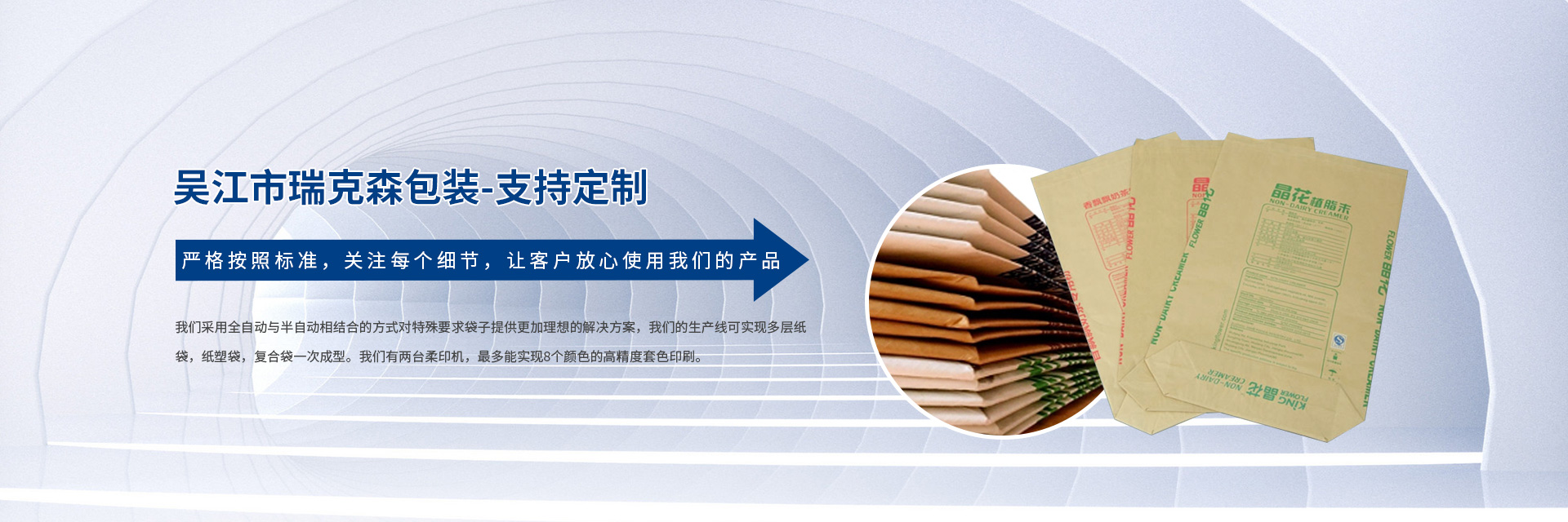 吳江市瑞克森包裝有限公司成立于2012年,坐落于蘇州太湖新城.我們主要為植脂末,奶粉,維生素等食品藥品企業(yè)提供包裝配套服務(wù)。瑞克森以安全,品質(zhì),環(huán)保,服務(wù)為經(jīng)營理念,建立符合食品衛(wèi)生要求的制造環(huán)境,并通過QS食品包裝安全許可證,IOS9001質(zhì)量體系認(rèn)證。公司始終堅(jiān)持采用優(yōu)質(zhì)的原料跟生產(chǎn)工藝,生產(chǎn)的閥口袋,方底袋,熱封口袋,紙塑復(fù)合袋等完全能滿足全自動(dòng)灌裝的要求。